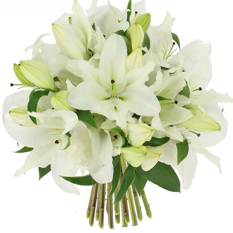 Букет состоит из 6 веток белых лилий, прозрачная упаковка, атласная лента.