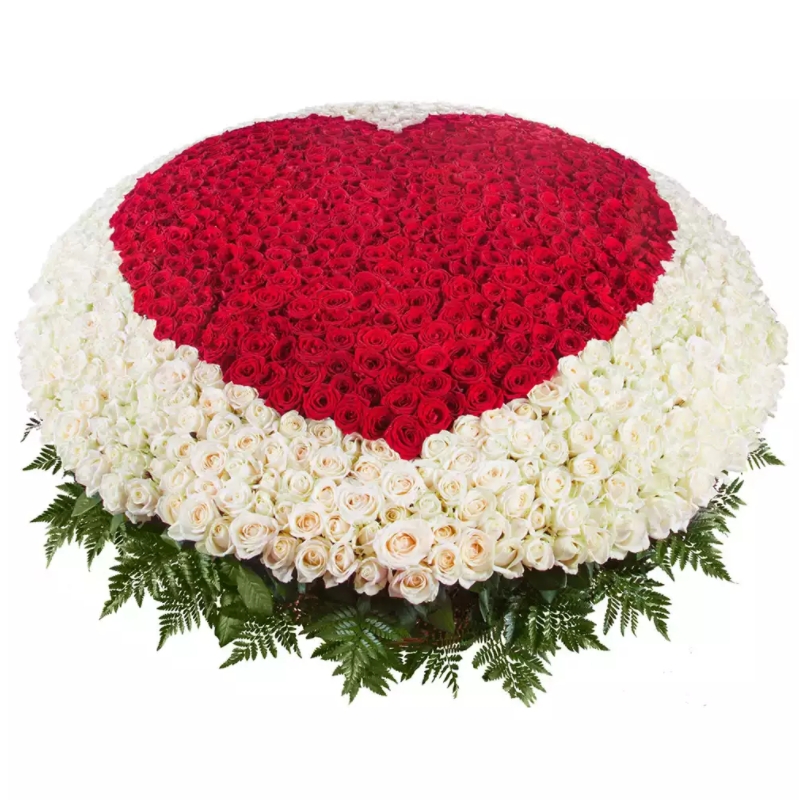 1001 красная и белая роза, зелень, корзина, оазис.